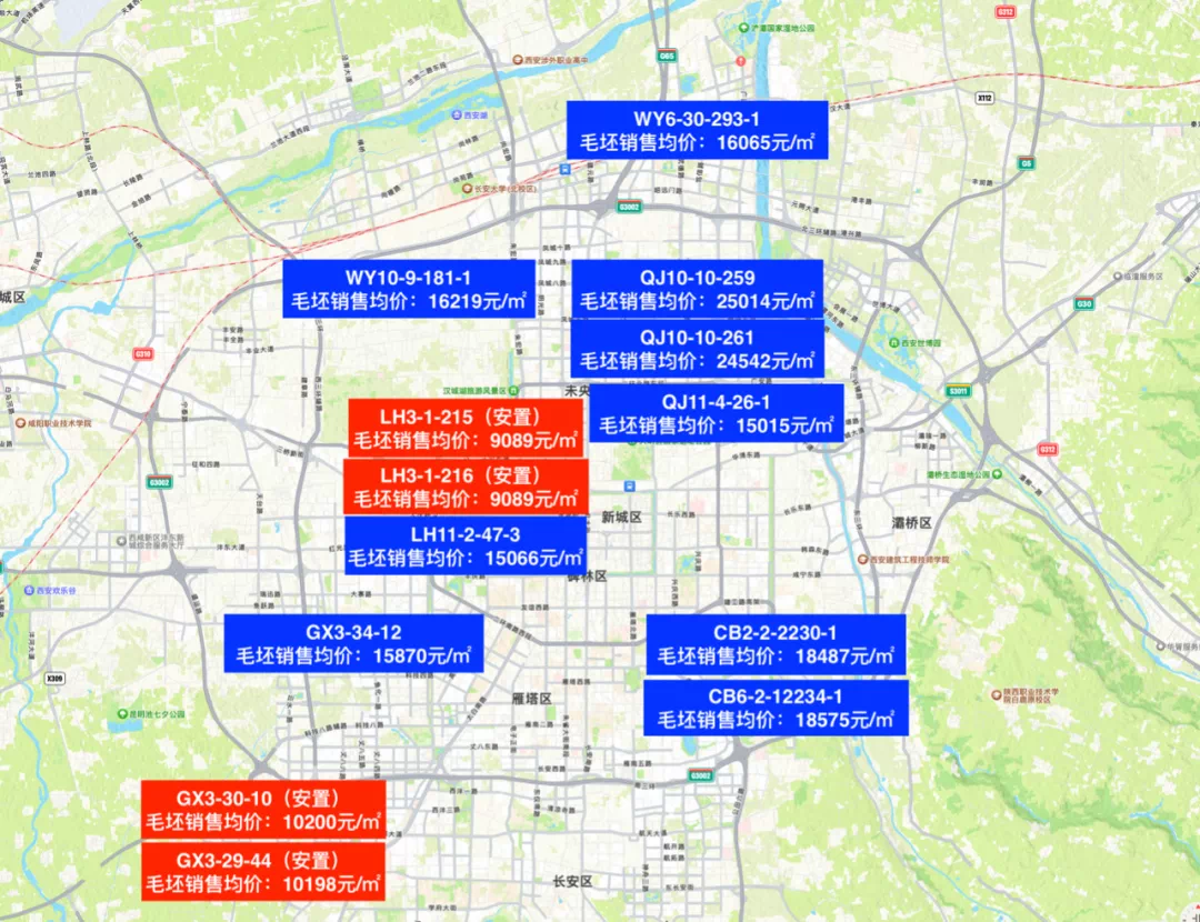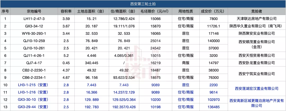 本次集中土拍其余地块的情况为:WY6-30-293-1:位于未央区学府环路以东,显庆路以西,昭远门路以北,文德路以南。用地面积:32.533亩;规划容积率:不大于3.44;起始价:17146万元;成交总价:17146万元;成交楼面价:7906元/㎡;毛坯限价:不高于16065元/㎡拿地单位:龙记地产GX3-30-10:位于高新区西太路以东,翠北路以北,林薇路以西,云桥路以南。用地面积:129.889亩;规划容积率:不大于2.8;起始价:102970万元;成交总价:102970万元;成交楼面价:4247元/㎡;毛坯限价:不高于10200元/㎡;拿地单位:西安市高新区城更隆泊房地产开发有限公司GX3-29-44:位于高新区东西五号路以南,南北二号路以西,西三环南延伸线以东。用地面积:192.783亩;规划容积率:不大于2.5起始价:136485万元;成交总价:136485万元;成交楼面价:4248元/㎡;毛坯限价:不高于10198元/㎡;拿地单位:西安市高新区城星辉房地产开发有限公司QJ7-4-17:位于曲江新区南三环以南、长鸣路以西。用地面积:360.445亩;规划容积率:不大于0.45;起始价:160000万元;成交总价:160000万元;成交楼面价:14797元/㎡拿地单位:西安卧龙置业有限公司此部分中,位于高新的地块,毛坯限价为1.5万/㎡,由南飞鸿摘得。本次供地中,含有4宗安置用地,2块位于高新,2块莲湖区。其中高新的2宗地块面积较大,合计超过20万㎡。