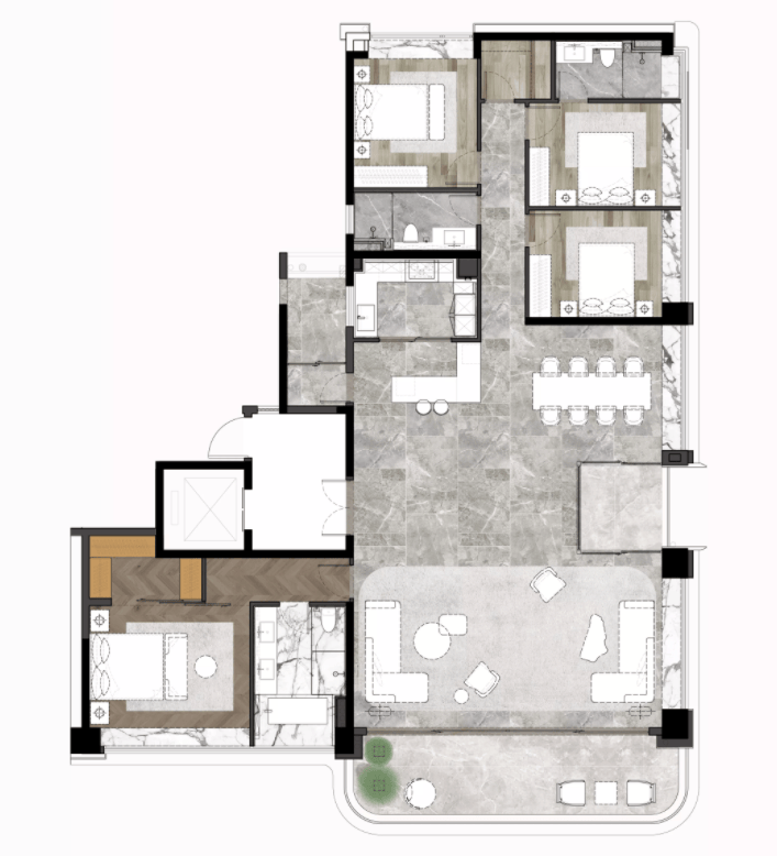 傲云 建面约 129-277m²的大空间尺度上,采用了无立柱设计,户型内几乎可以做到空间全打通,房间布局随心所欲,可以实现整层空间全通透,或上下层联通,满足如高管会客厅、轻奢酒店、品牌展示空间、私密会所等使用场景,让峯层的都芯事业生活,更自如由心。
