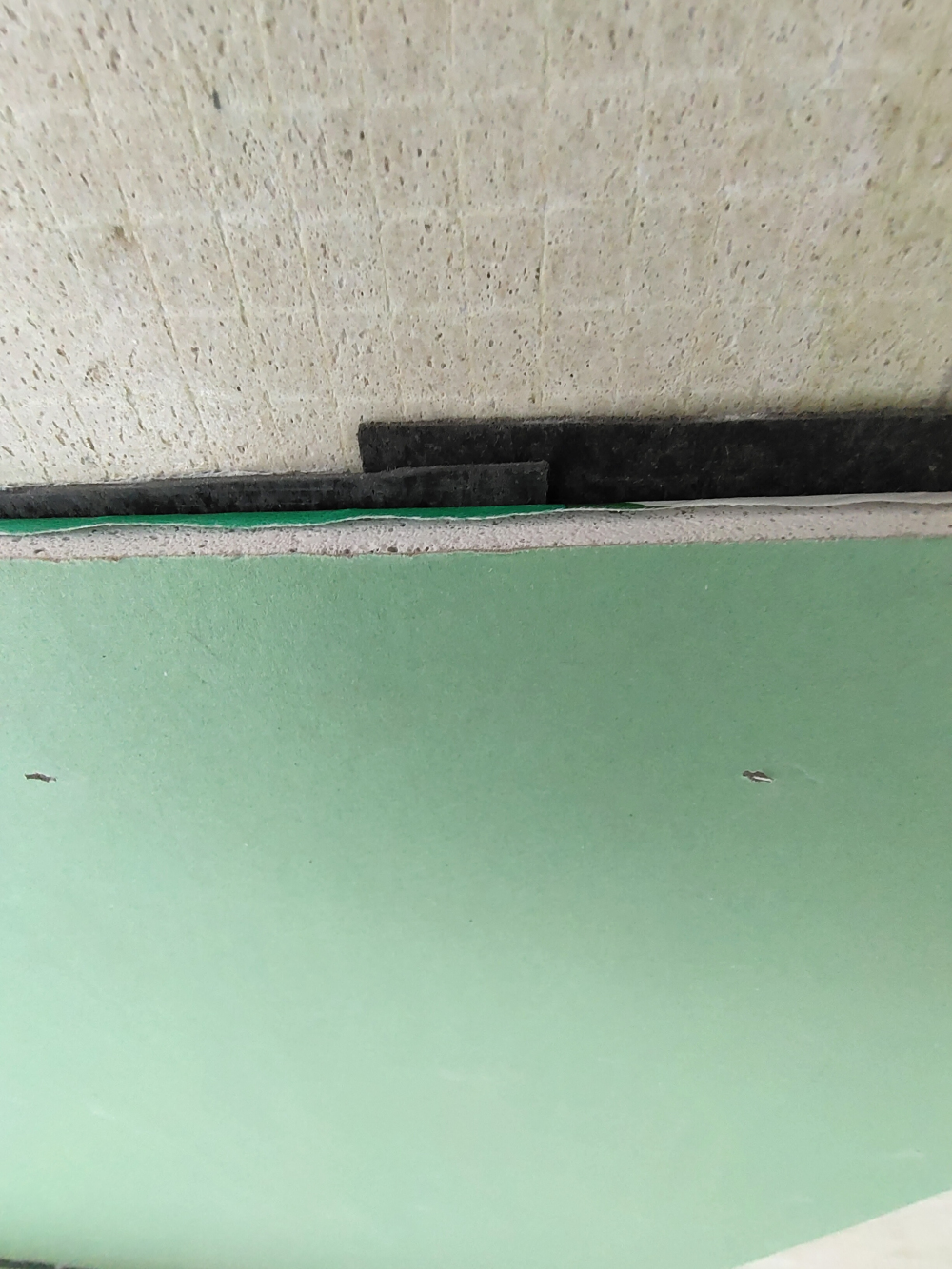 15、隔音毡超出石膏板上顶之后会有卷边,这样能确定隔音毡铺到位了。