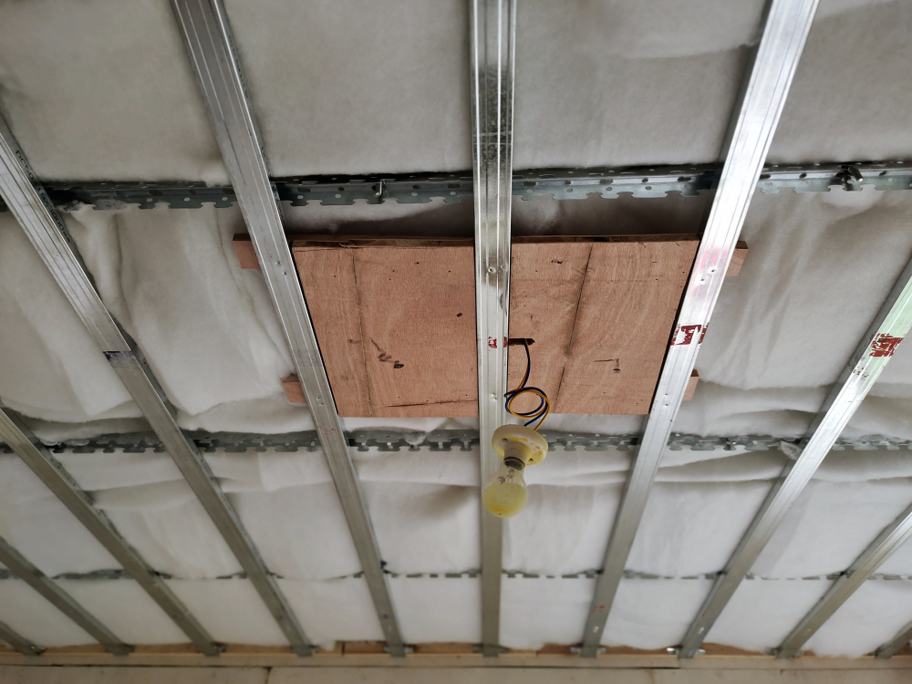 8、主灯位置大芯板打底加固,方便后期固定灯具,因为隔音板没有“握钉力”。