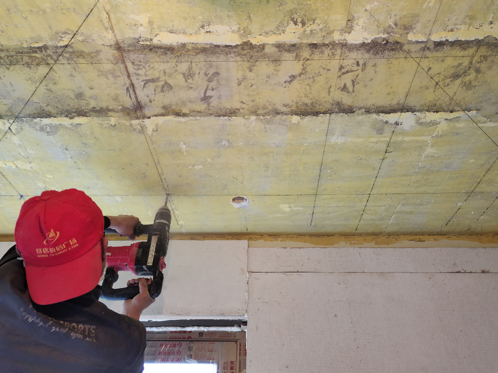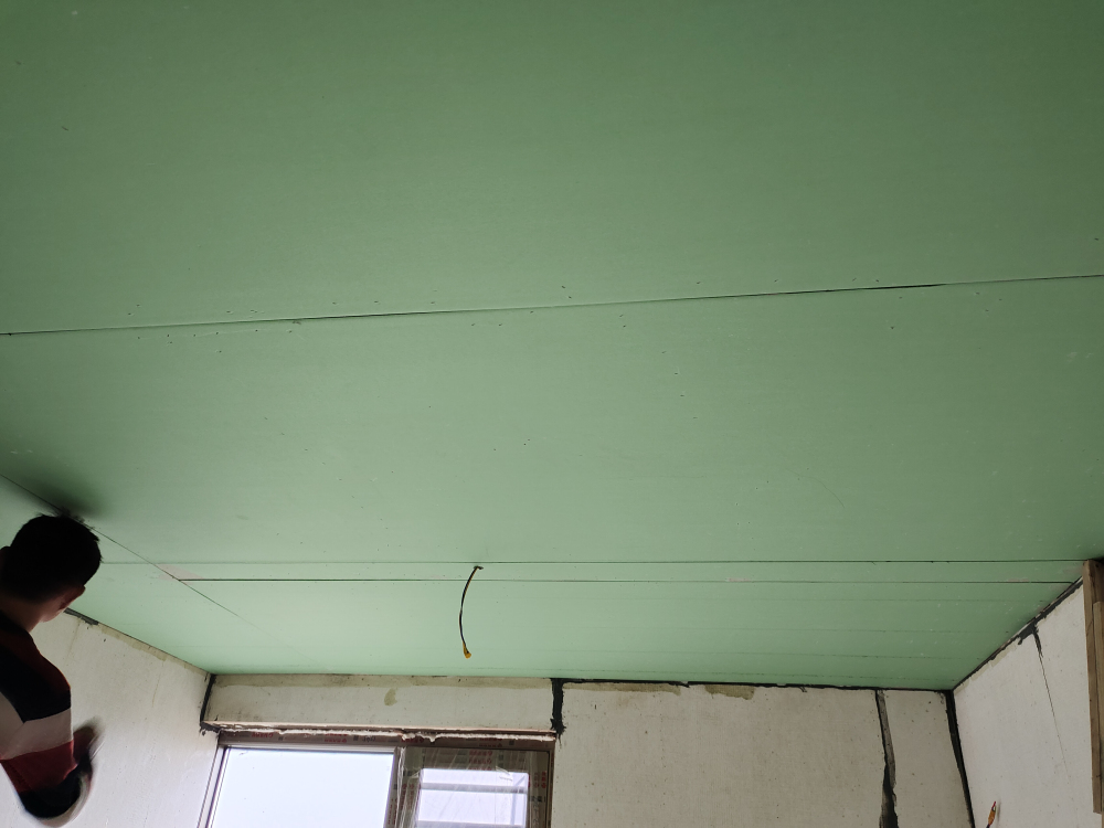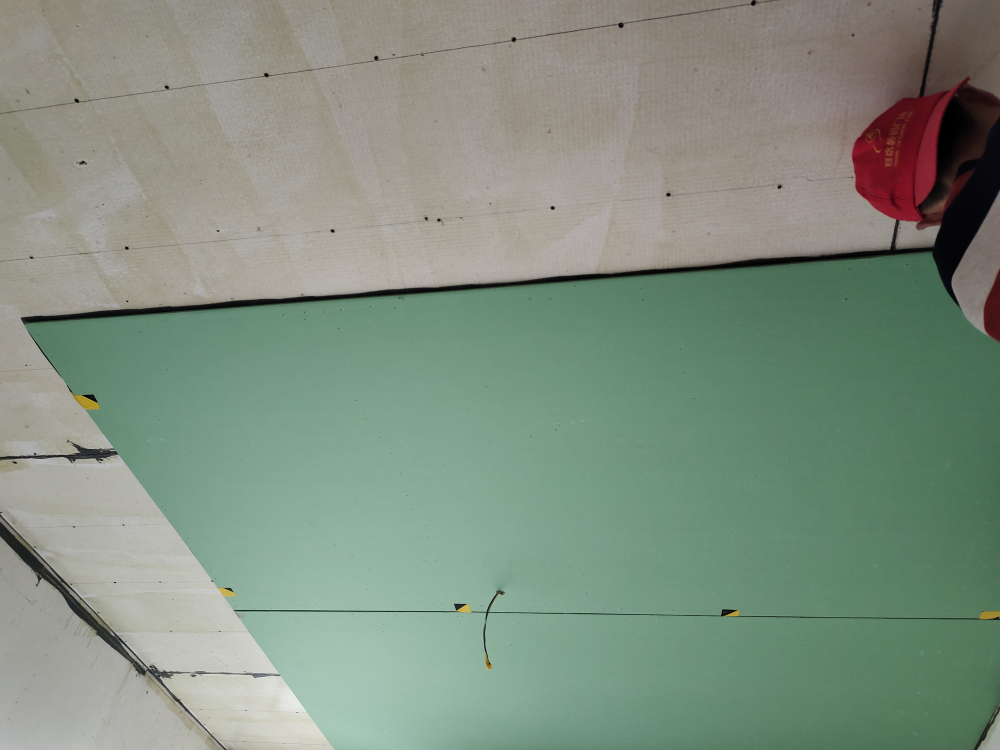 9、隔音板安装,规划好尺寸,尽量减少拼接缝隙。整板上顶特别重,需要两个师傅+支撑架才能安装到位,复式等层高超过3米的户型甚至要用升降机支撑。