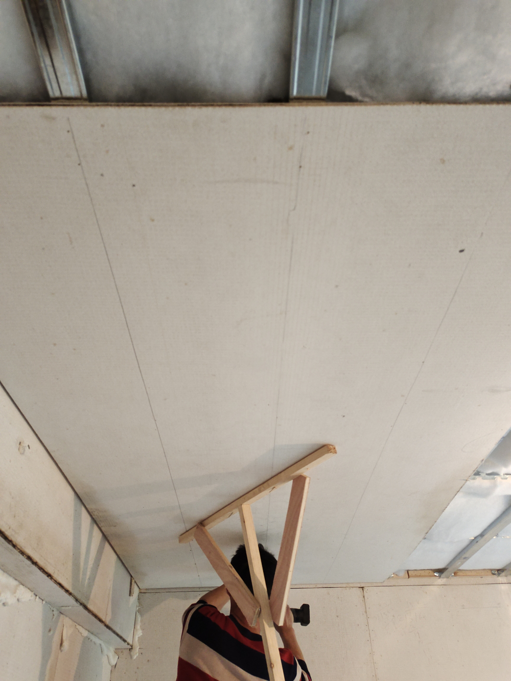 12、隔音毡上顶,这才是最难搞一步,隔音毡很重而石膏板又脆容易折断,安装时需要很小心。毡+板同时上顶的好处是免去了用 全能胶固定隔音毡,大家都知道胶水不环保,家装少用为好。