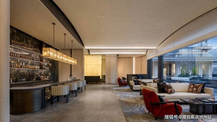 大面积的玻璃幕墙,搭配木纹铝板等暖色系材质,弧线及立面型材工艺的运用,汇成浪漫的美拉德暖色美宅,这是兴耀标识性的设计——「艺术级流体无界屏」,与金沙文教区的气质交相辉映。