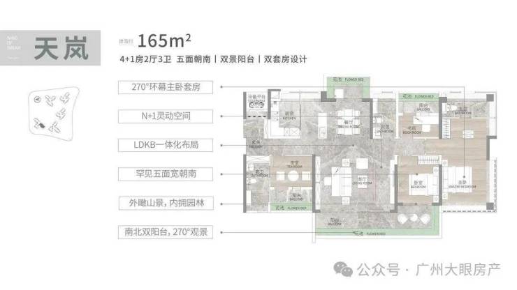 建面165平4+1房大平层,双阳台南北对流,四开间朝南,中式厨房+独立西式岛台,三面望山景,朝南面宽达到17.4米,近9米的L型景观阳台,双主套设计,南北对流,主卧同样270度折叠屏飘窗
