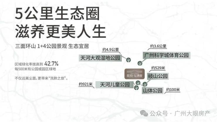 外揽“1+4公园”:山体公园、天河区儿童公园、岐山公园、天河大观湿地公园、广州科学城体育公园。