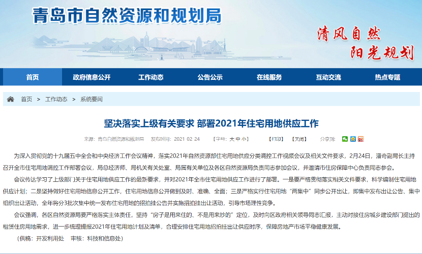 2月24日,青岛市自然资源和规划局发布通知,严格实行住宅用地“两集中”,同步公开出让。全年将分3批次集中统一发布住宅用地的招拍挂公告并实施招拍挂出让活动。这标志着青岛集中供地全政策策的出炉。
