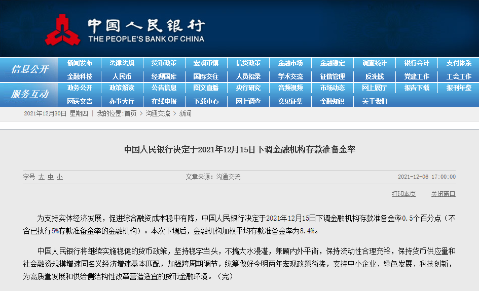 12月15日,央行发布通知,调金融机构存款准备金率0.5个百分点,释放长期资金约1.2万亿元。这是今年以来,中国人民银行第2次全面降准。