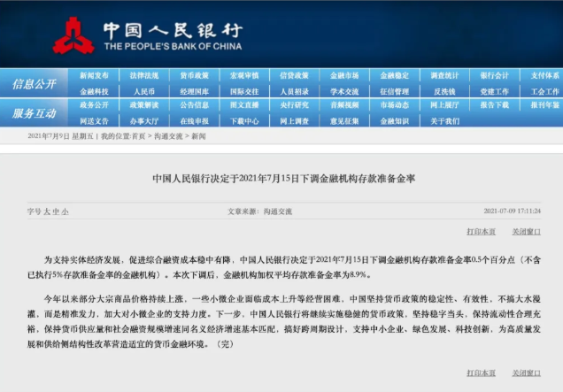 7月9日,央行发布通知,下调金融机构存款准备金率0.5个百分点,降准释放长期资金约1万亿元。这是今年以来,中国人民银行第1次全面降准。本次下调后,金融机构加权平均存款准备金率为8.9%。这一举措是国家为支持实体经济发展,促进综合融资成本稳中有降。