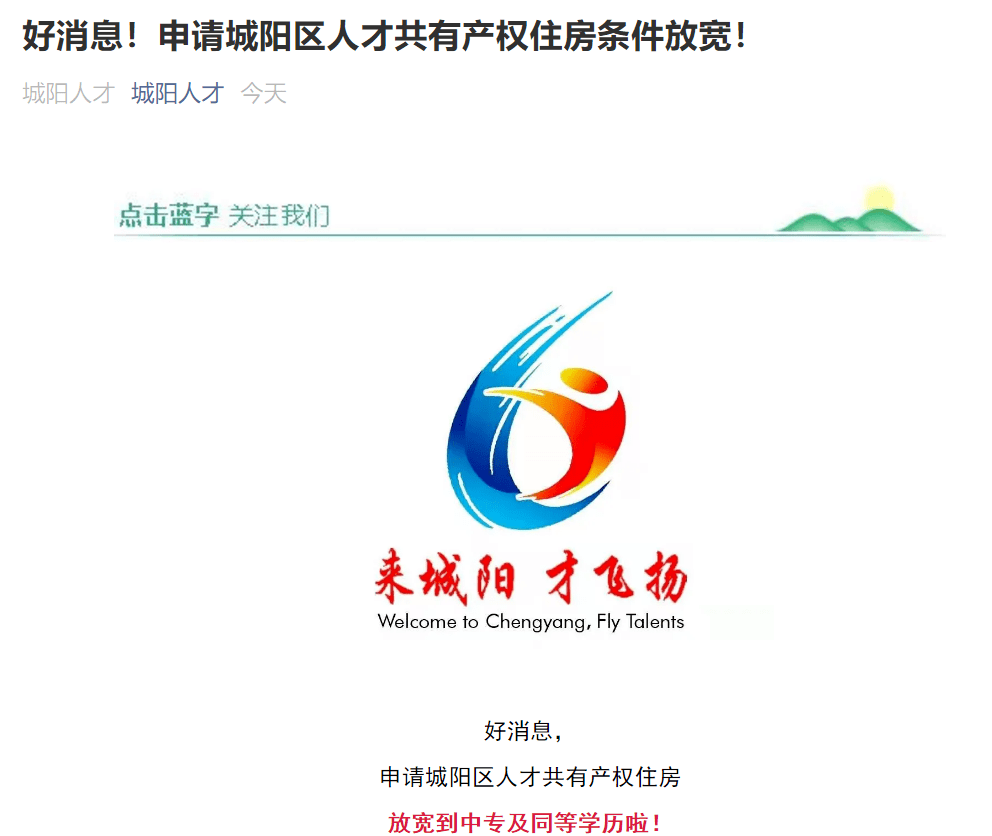 2月20日,城阳区发布消息,城阳区人才共有产权房申请条件放宽到中专及同等学历,为城阳区共有产权政策加码。3月6日,中专及同等学历人员被纳入第七层次人才范围。不同层次人才购房时,由企业承担购房总价的30%,与企业共同享有房屋产权。这标志着城阳打响了青岛2021年“人口争夺战”的排名前列枪。