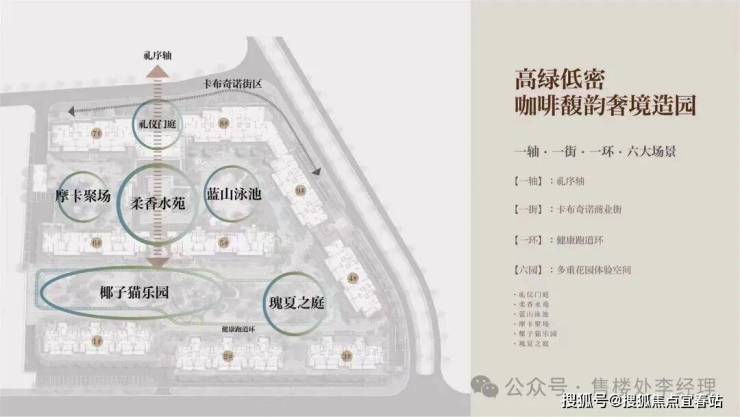 项目在设计上独具匠心,打造了 “一轴・一街・一环・六大场景” 的咖啡馥韵奢境园林。“一轴” 即礼序轴,彰显归家的仪式感;“一街” 为卡布奇诺商业街,充满浪漫风情;“一环” 是健康跑道环,满足业主日常运动需求;“六园” 包含礼仪门庭、柔香水苑、蓝山泳池、摩卡聚场、椰子猫乐园、瑰夏之庭,为业主带来丰富的花园体验空间,营造出高绿低密的舒适居住环境。