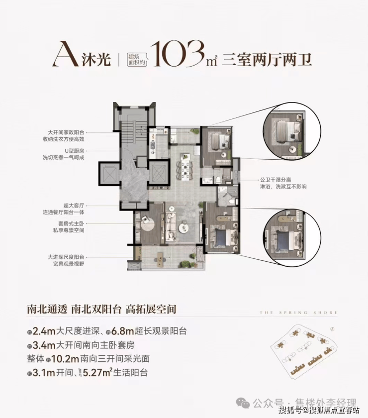这个户型收纳洗衣便捷高效,设有大开间家政阳台。厨房洗切烹煮一气呵成,公卫干湿分离,互不影响。客厅与餐厅连通,空间开阔。套房式主卧,搭配大进深尺度阳台,拥有宽幕观景视野。南北通透,南北双阳台设计,拓展空间大。南向主卧套房开间 3.4m,还有 2.4m 大尺度进深、6.8m 超长观景阳台,整体 10.2m 南向三开间采光面,阳光满满。