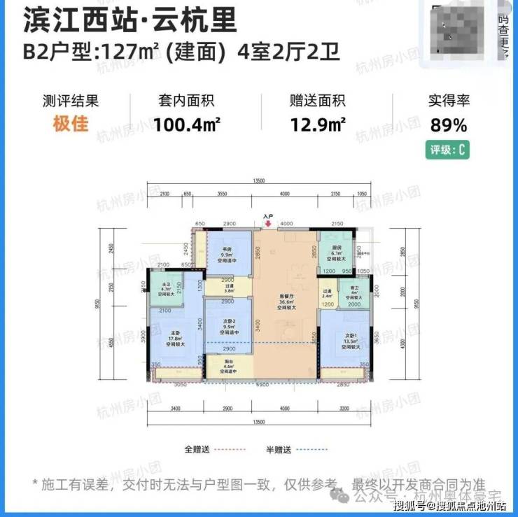 - 户型细节:套内面积约100.4㎡,赠送面积约12.9㎡,实得率89%;3卧室+客厅朝南,书房带飘窗;主卧带独立卫浴、衣帽间,私密性好;客卫干湿分离,全明无暗卫。