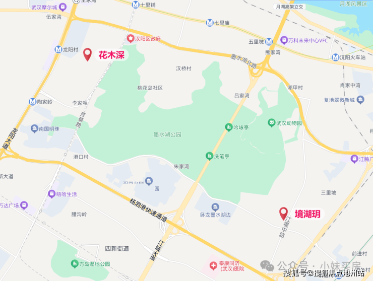 跟境湖玥对比,花木深相对更靠近二环,并且更靠近地铁站,还是双地铁线,王家湾板块的商业配套也更为丰富成熟,花木深生活方面明显更方便一些。