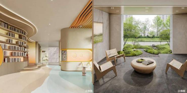 结合建筑、空间、自然环境关系,室内室外联动,呈现一个景观会客、海浪书屋、儿童休闲等多重功能的泛会所架空层,为全龄社交营造一个“有温度、有态度”的邻里空间。