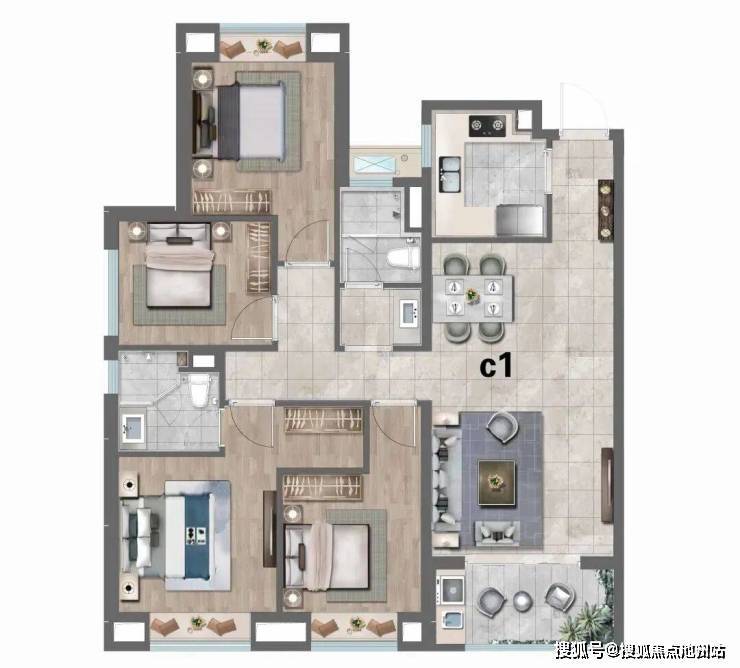 建面约127平4房2厅2卫户型 ,做到了 三开间朝南+三卧室带飘窗+主卧套房设计+卫生间干湿分离+动静分离+南北通透 ,功能非常齐全的4房户型。