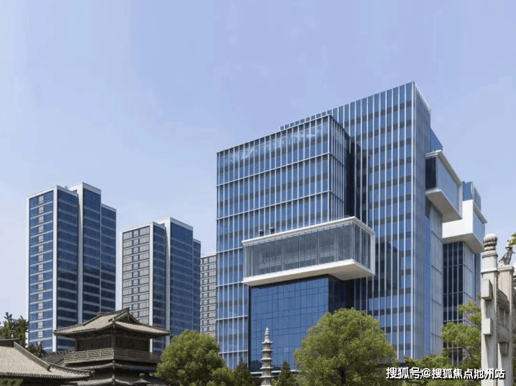 虽然拿地规划时间都很早,但从立面来看非常具有前瞻性。公建化的四面铝板外立面,十分现代,整体色调为“英蓝灰”和玻璃的“宝石蓝”,颜值非常高,与一旁古香古色的香积寺形成鲜明对比。