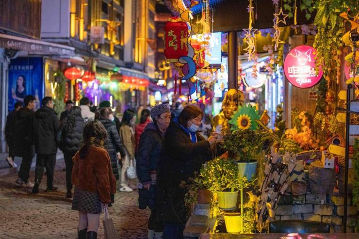 2月15日,游客在宁波老外滩步行街夜集市上购买食品。新华社记者 江汉 摄