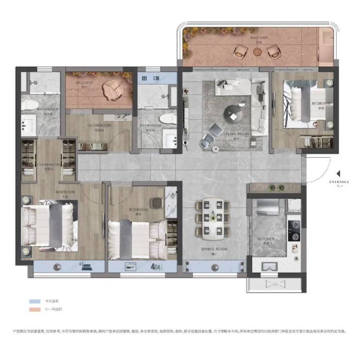 135㎡四房两厅两卫,约7m观景阳台,宽阔视野收藏中轴绿廊。