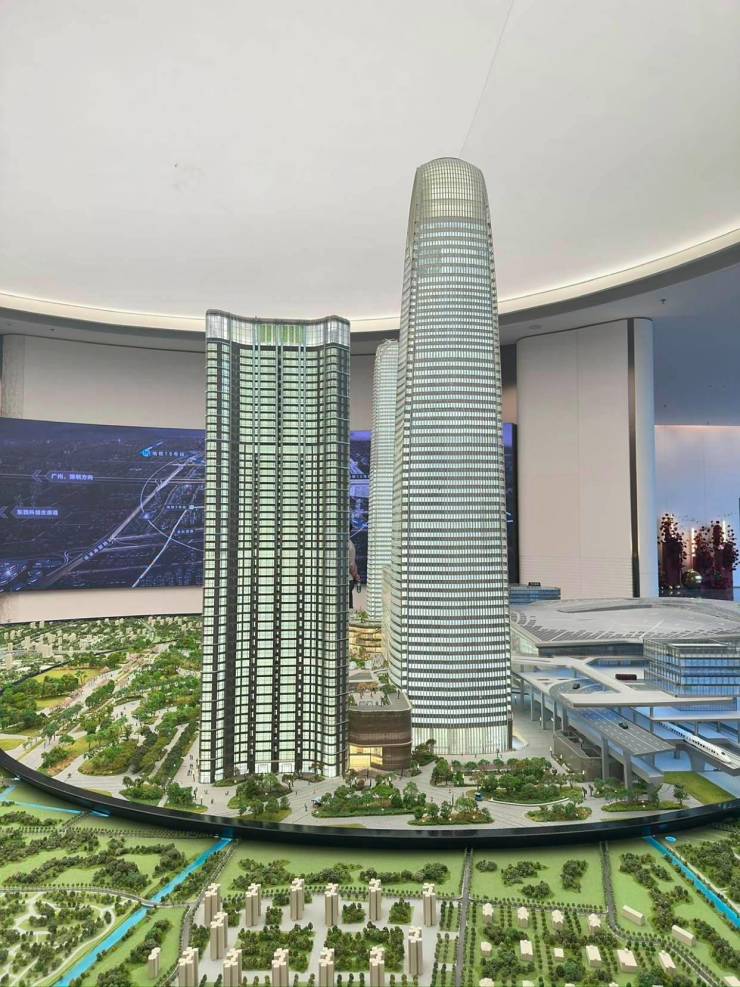 目前C、D公寓塔楼框架式幕墙立面已基本完工;设计高度约320米的金手指A塔施工至53层,建筑高度超236米;设计高度约300米的B塔楼施工至58层,