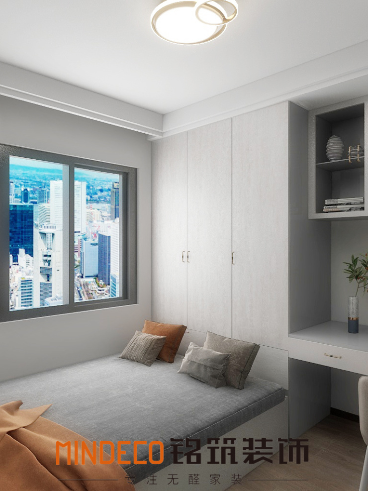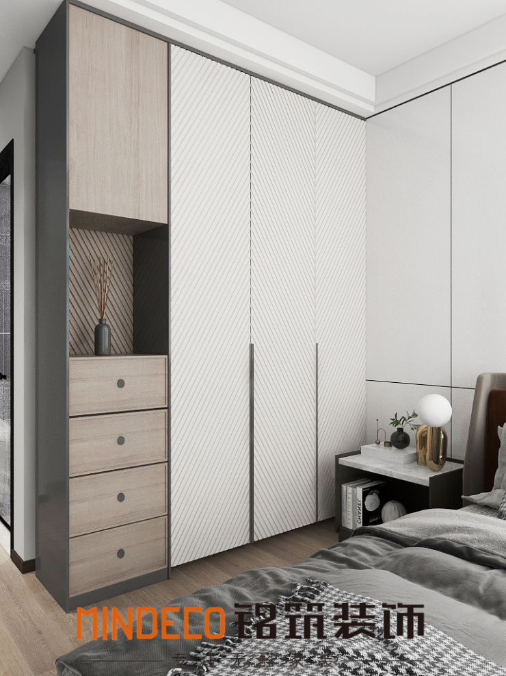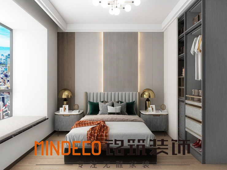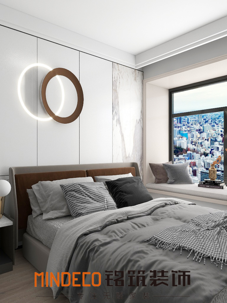 主卧采用了木质地板,嵌入式衣柜,增加了储物空间的同时,也有幸福感。魔豆灯与床头的两个蘑菇灯相呼应,带来丰富的视觉体验。主要以暖灰色和白色搭配起来,让卧室看起来就很有档次