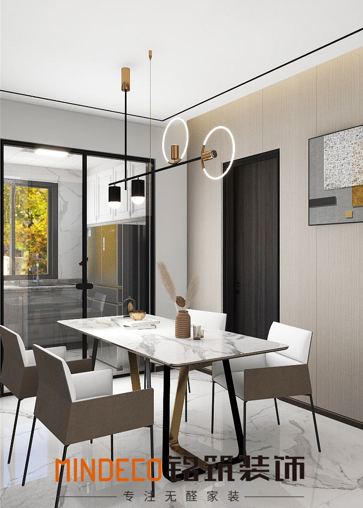 厨房与餐厅用玻璃门做隔断,给人一种十分高雅的感觉,避免油烟的同时,还能让空间更显通透感大理石餐桌方便打理还能提升气质。简单耐看的时尚吊灯,透露出时尚的气息