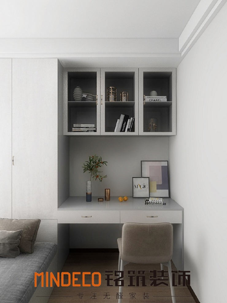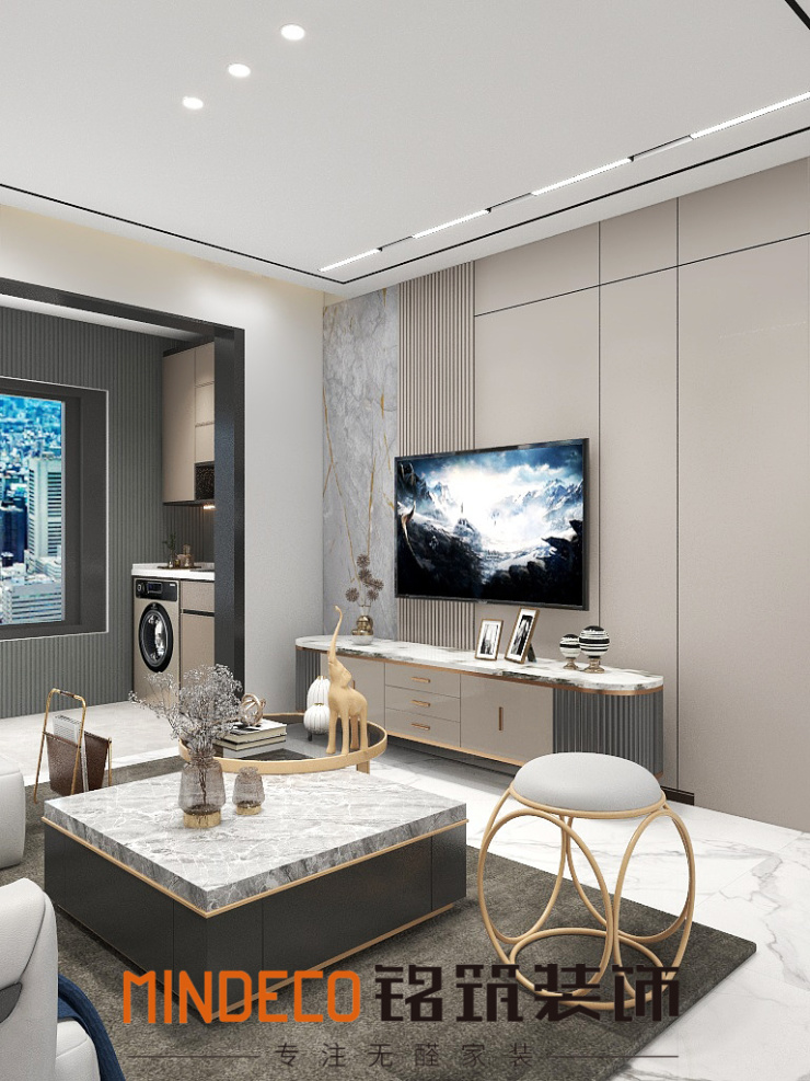 客厅整体以灰色系为主,无主灯设计,让照明变得更加温馨有艺术,悬空式电视柜,合理运用墙面空间,节省地面,方便打扫卫生,温暖精致感方形茶几,随心随性,给生活多一点想象。地面通铺瓷砖,让整个空间明亮又整洁
