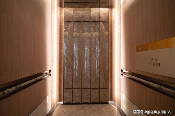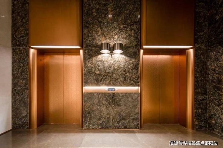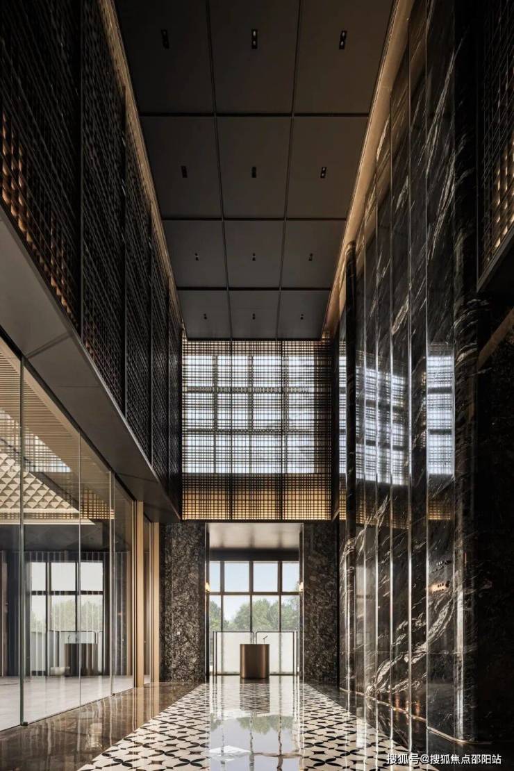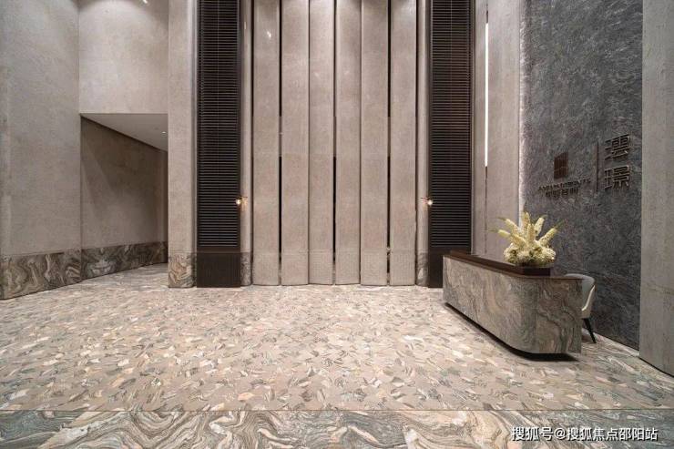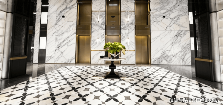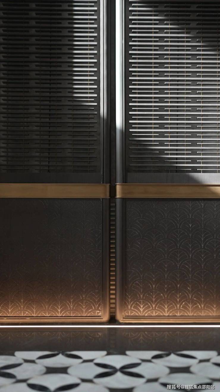 外围立体定制的楼栋指示牌、入户大堂的黑白拼花地板、激光雕花金属屏风,乃至电梯厅底部镶嵌的巨幅金属符号、雕花背景墙及电梯门饰,无不体现设计的一致性与精细度。