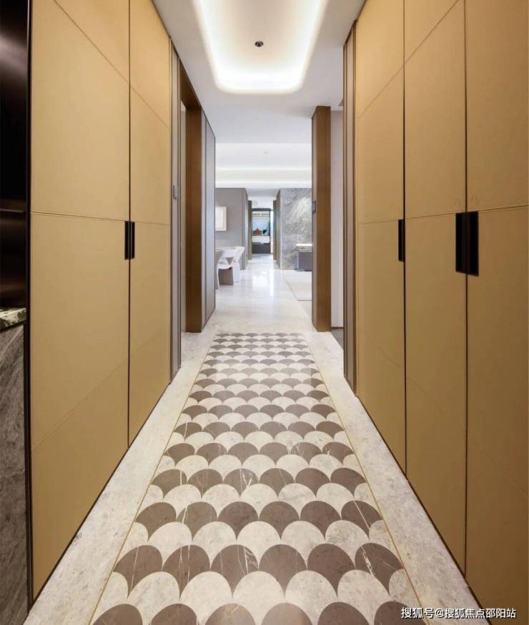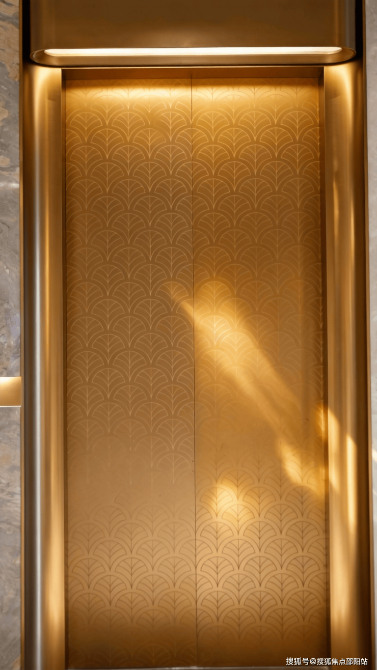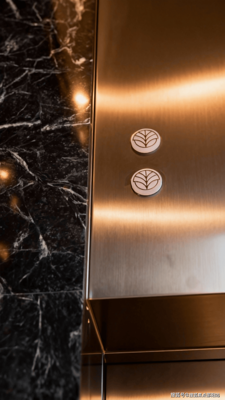 入户大堂的黑白拼花地面、巨幅艺术拼花图案,以及电梯门面的金色激光雕花背景墙,目之所及皆为大城美学的符号显化,营造出强烈的品牌沉浸感。
