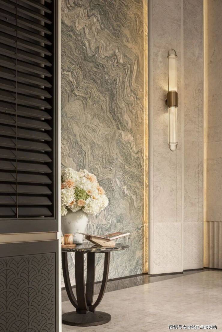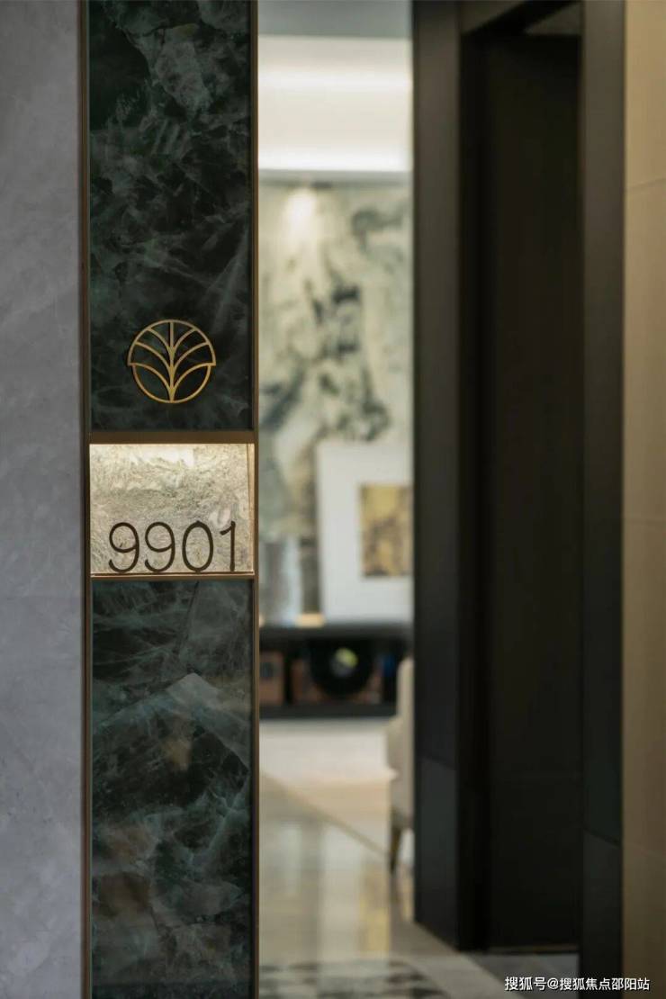 在「澐璟」组团的示范区及异地样板间中,“丰盈之心”与大城辅助图形被广泛应用于细节之中:大堂地面拼花、石柱屏风雕花、电梯厅背景纹理、架空层定制门牌及棋牌道具等,均以定制化视觉语言,持续强化组团的独特身份与美学深度。