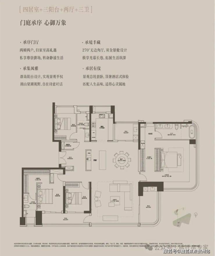 超大尺度的南向景观阳台,连通两个卧室,起居动线更舒适。两个主卧套间,分布在两侧,互不打扰,最大的主卧有个超大卫生间,能放下浴缸,且能270°观景。