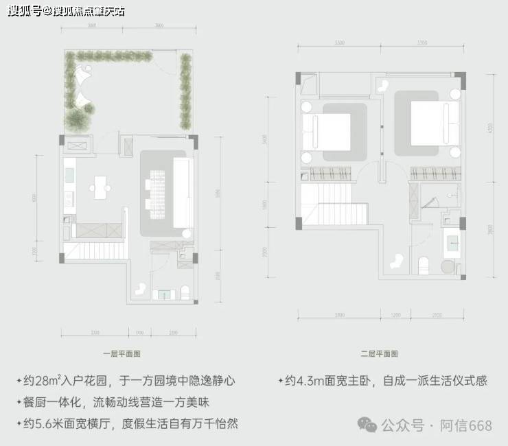 下叠:使用面积约 210㎡,拥有三室四厅三卫一庭院。入户庭院直通卧室,让业主一回家就能感受到大自然的气息,庭院还可栽种花草,打造属于自己的小花园。室内空间布局合理,客餐厨双厅格局,动静结合,既能保证家人之间的亲密互动,又能有各自独立的空间。