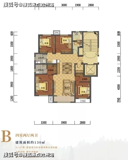 130平四室两厅两卫,餐客一体,南向面宽达到10米,做了步入式玄关,主卧带有独立的衣帽间和卫生间,南向次卧也设置了衣帽间,格局方正,南北通透,也都是全明格局。
