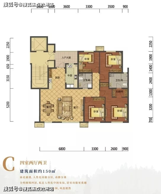 150㎡四室两厅两卫,从图上来看,设有入户大堂。亮点在于有面宽6.8米的方形客厅,带有两个窗户,四个卧室居于一侧,动静分区较好。