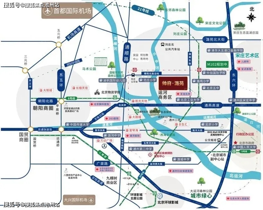 帅府潞苑位于通州核心区小中河旁,挨着中国民兵武器装备陈列馆,距离在售的禹州·朗廷湾直线距离约1公里,项目东至陈列馆路,西至小中河,北至朝阳北路,南至靶场路。