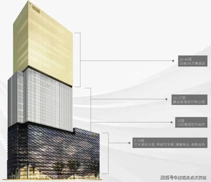 :项目为综合体建筑,1-14 层是甲级商务写字楼、精奢商业、高端影视会所;15 层为高端私人酒店会所;16-27 层是嘉裕中心・J 公馆;28-46 层是 JW 万豪酒店。