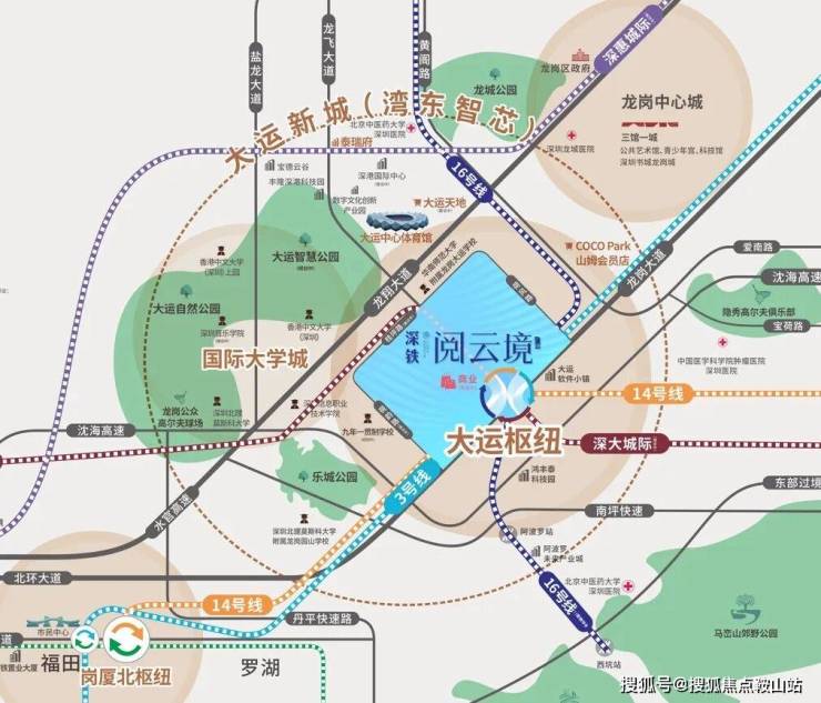 深铁阅云境是东部最大的大运交通枢纽站上盖物业,所在的“大运枢纽站”汇聚了3/14/16号线,以及33号线(深大城际),地下室可直达乘坐地铁站,5站到布局枢纽站,可换乘5号线,6站到罗湖,7站到福田黄木岗,8站到福田岗厦北枢纽站。