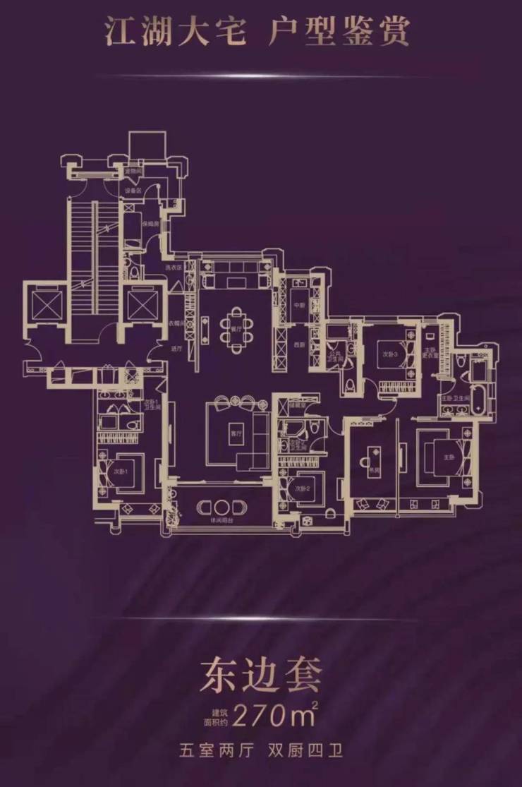 270㎡5房2厅+中西双厨+4卫,5开间全朝南,南向270度景观阳台,视野开阔,湖景一览无余,尊享奢华和私密感。