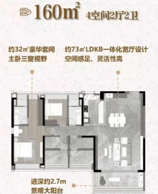 160㎡四房两厅两卫,总价900万-1300万,低楼层房源总价可控制在千万内,2梯3户格局