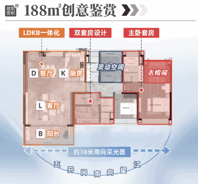 生活阳台满足日常收纳,观景阳台直面珠江,主卧为套房设计,带独立卫浴与飘窗,适合三代同堂的改善家庭;