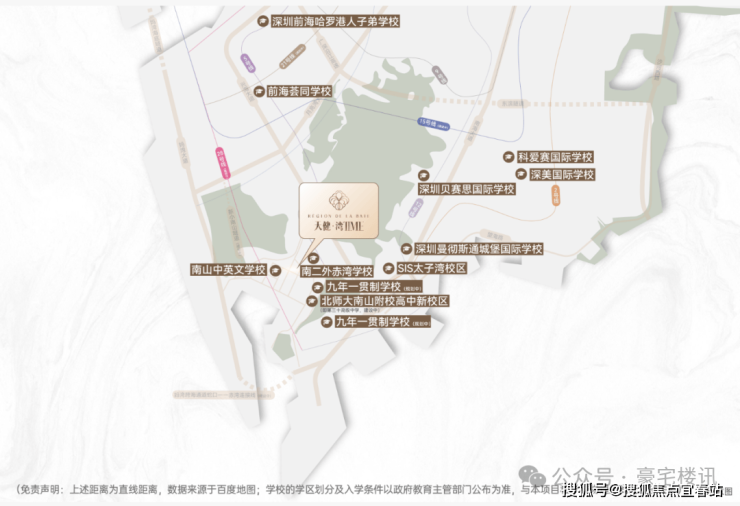 (免责声明:上述距离为直线距离,数据来源于百度地图;学校的学区划分及入学条件以政府教育主管部门公布为准,与本项目和学校物理距离无直接关系)