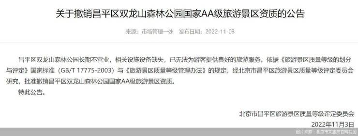 北京商报讯(记者 吴其芸)11月3日,据北京市文旅局官网,昌平区双龙山森林公园长期不营业,相关设施设备缺失,已无法为游客提供良好的旅游服务。依据《旅游景区质量等级的划分与评定》国家标准(GB/T 17775-2003)与《旅游景区质量等级管理办法》的规定,经北京市昌平区旅游景区质量等级评定委员会研究,批准撤销昌平区双龙山森林公园国家AA级旅游景区资质。