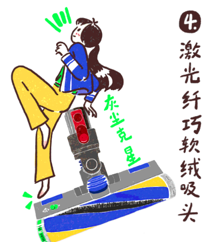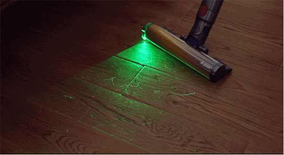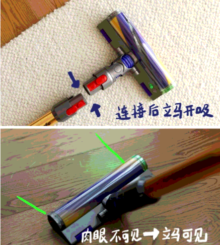 但这个黄蓝条纹的吸头能让所有小绒毛、灰尘颗粒都现形,激光一照,再顺着方向吸尘,立马一干二净。