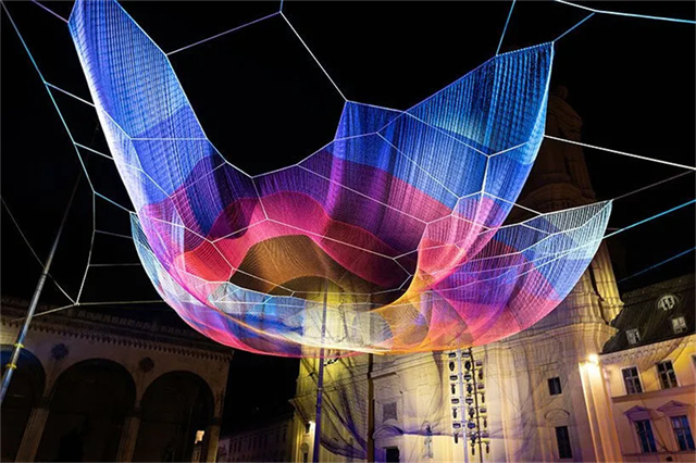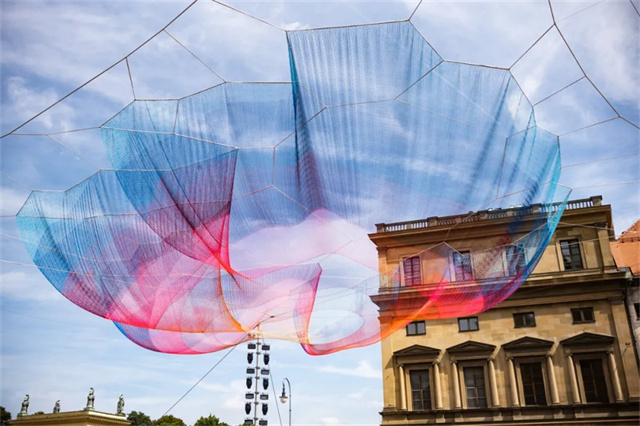 “地球时间 1.26 慕尼黑”大型艺术装置由美国艺术家Janet echelman设计,漂浮的绚丽雕塑由可回收纤维制成,是对自然生态的诠释。同时利用线带面,为广场营造艺术的氛围。
