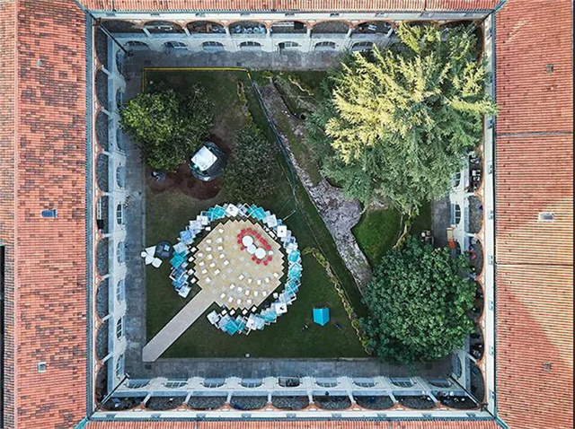 由二次利用和回收的材料制成的“环形实验室”艺术装置,运用IBC 吨桶、彩色薄膜和从跑鞋上回收的橡胶等材料围合成一个露天交流场所,再通过定制灯光产品,在视觉上标记空间,营造温馨的氛围。装置的运用同时也是倡导一种循环设计的文化理念,将设计与可持续发展相结合。