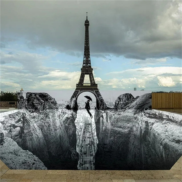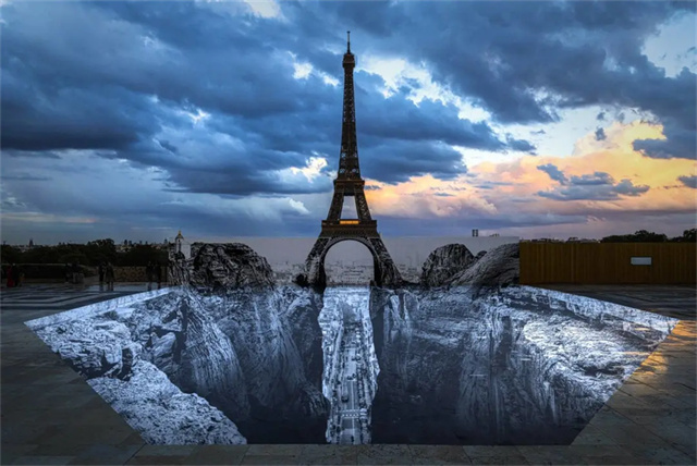 JR将埃菲尔铁塔下的地球场景一分为二,透过岩层便可看到不规则状的“地下城市”,呈现出一种似真似假的视野错觉。