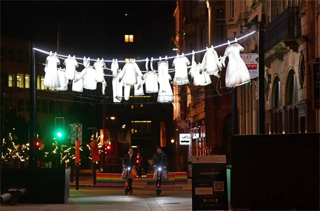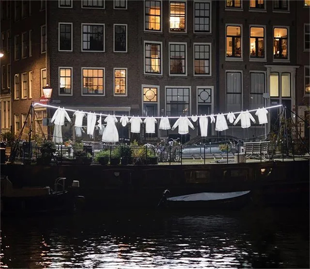 装置NEIGHBORHOOD是运用悬挂在晾衣绳上会发光的衣物衬托街区的生活气息,土耳其宽裤、犹太连衣裙、摩洛哥外衣等各式各样的欢快衣物代表了城市居民的文化和种族融合,向外传递出一种积极、和谐的场景。