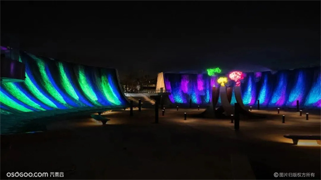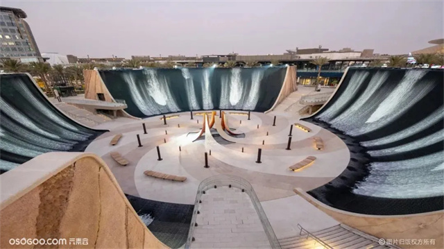 WET Design 创作的大型景观艺术装置Surreal运用区别于常规的向上喷射的喷泉形式,打造了一个冲浪式的喷泉,水流不仅能够自上而下,还能够倒流。在喷泉中央,还有一个火焰喷射装置,夜晚在灯光的渲染下,制造出一种水火共生的景象。