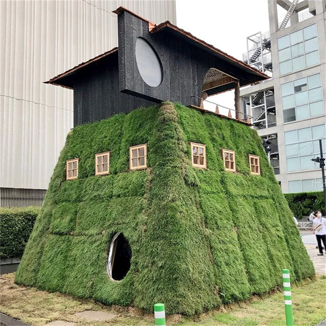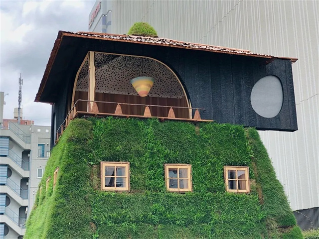五庵茶室作为一个体验与观赏相融合的艺术装置,建筑师藤森照信用长满草的墙壁和烧焦的雪松木屋顶在草地上打造一个金字塔形状的小屋。顶层的茶室需要从一层爬梯子才能抵达,而梯子重新诠释了传统日本茶室中小小的入口,客人只能跪行“爬入”茶室以表示对主人的尊敬。