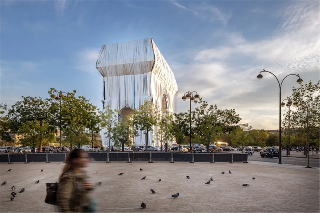 巴黎的凯旋门纪念碑化身为城市中央的艺术装置,换上25000平方米的银蓝色可回收聚丙烯织物和3000米的红色绳索组成的“新衣”,堪称是2021年全球最伟大的公共艺术作品。