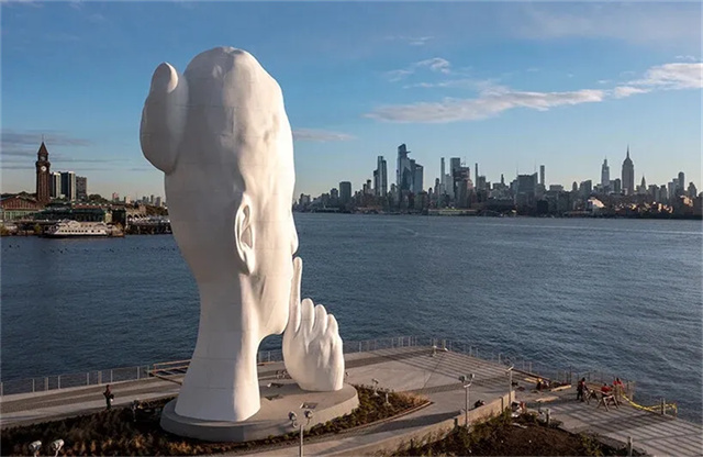 位于曼哈顿市中心纽波特码头公园的巨型艺术装置——“水的灵魂”,是迄今为止较高的公共雕塑。它是由艺术家豪梅·普伦萨打造的白色树脂人头雕塑,女子面朝大海发出“嘘声”的形态也是寓意着要求外部世界收声,希望在纷扰嘈杂中觅得片刻的宁静,聆听内心的声音。